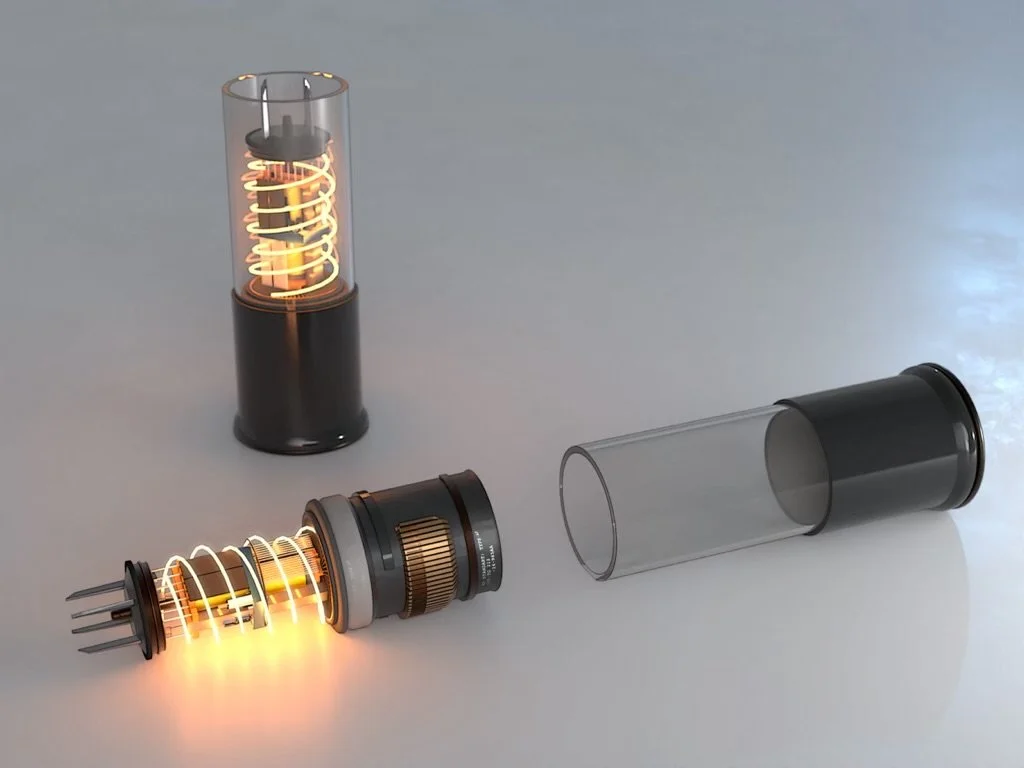 A vacuum tube with glowing filaments and a separate glass casing.