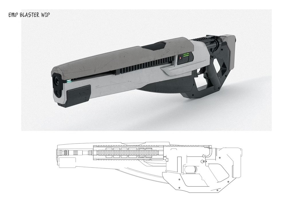 A futuristic, sci-fi style gun with a sleek, gray and black design, displayed upright with a technical line drawing of the gun below it.