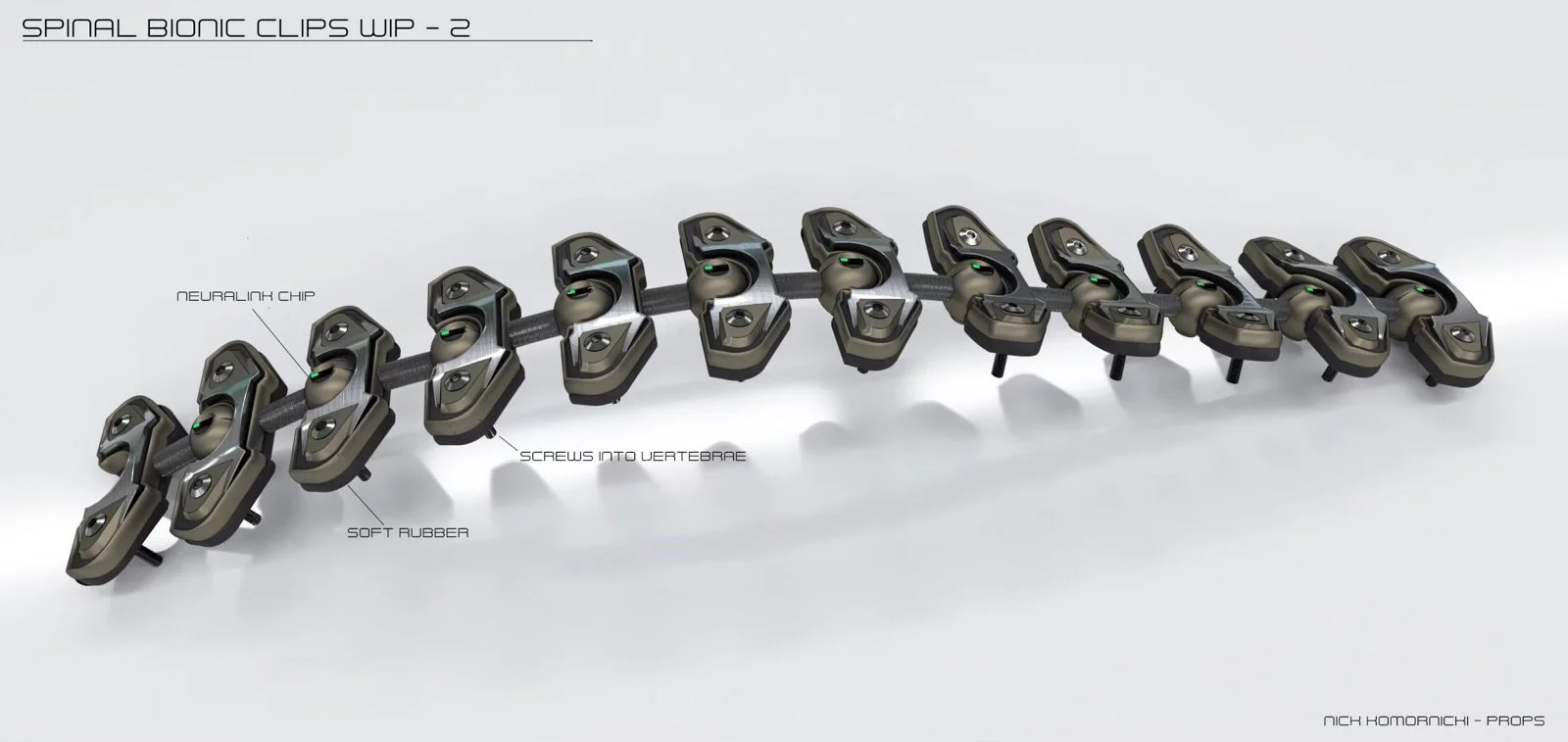 Diagram of a spinal bionic clip system with multiple clips connected by a flexible band, showing components labeled as neuralink chip, screws into vertebrae, and soft rubber.
