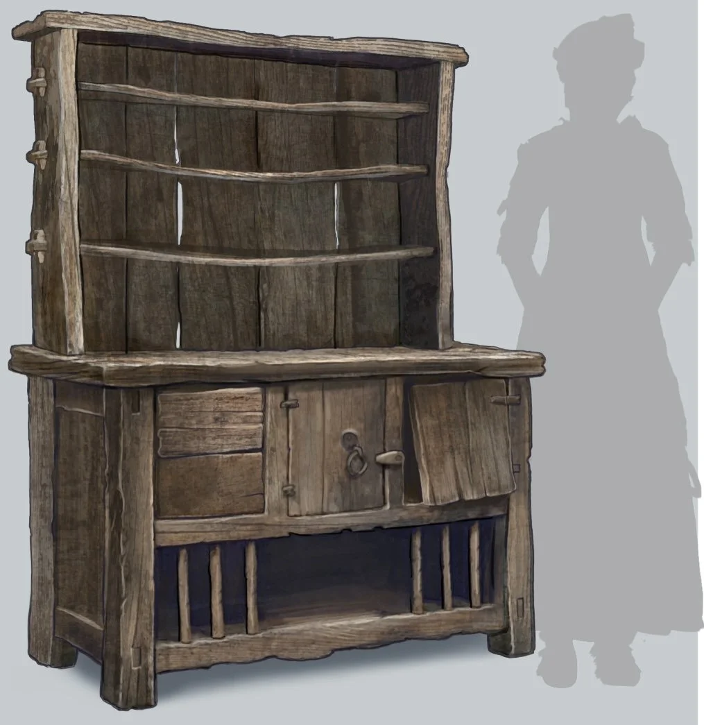 A rustic wooden hutch with open shelves and a small cabinet, made from weathered wood, against a plain background with a silhouette of a woman in period clothing.
