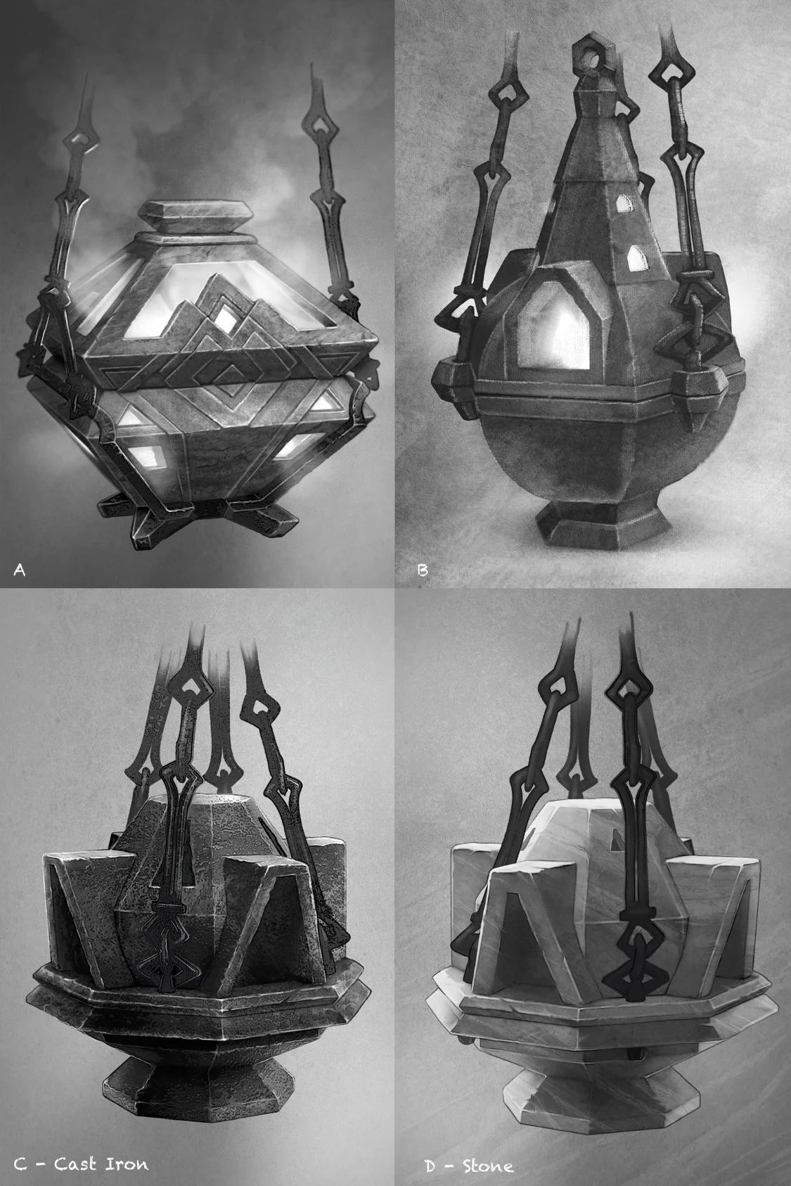 Four black and white sketches of floating, ornate, medieval-style containers with three chain-like figures hanging from the top. Each container has unique shapes and material textures labeled as A, B, C - Cast Iron, and D - Stone.