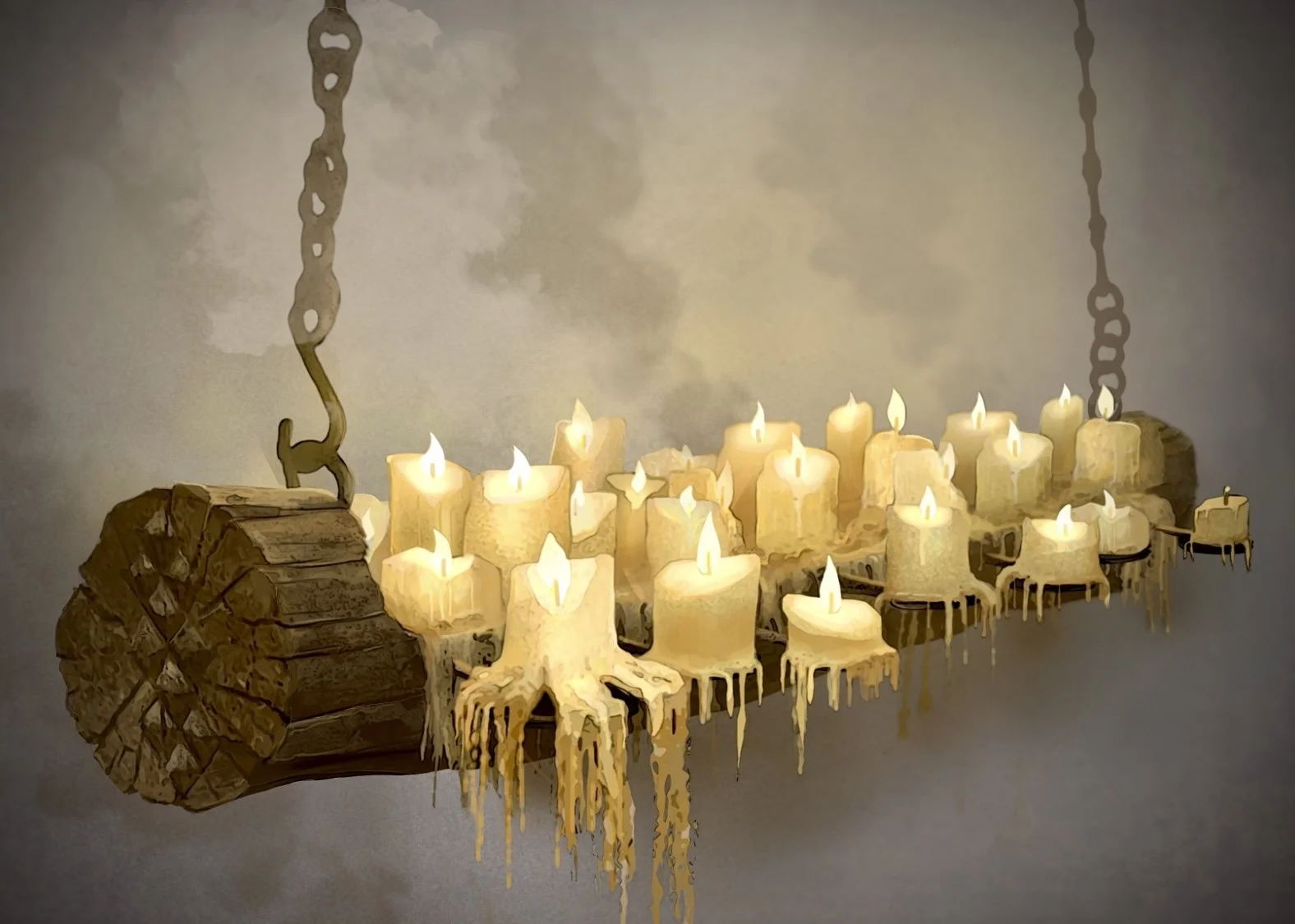A chandelier made from a wooden log with hanging candles, some melting and dripping wax.