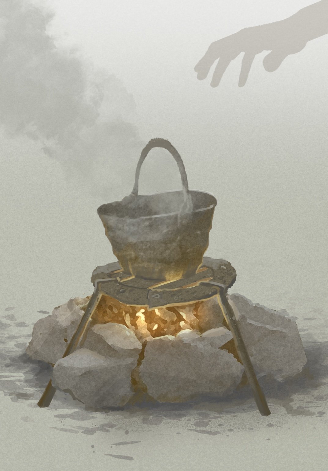 A small camping stove with a pot on top, sitting on rocks with a fire underneath. A hand is reaching down from the top right.