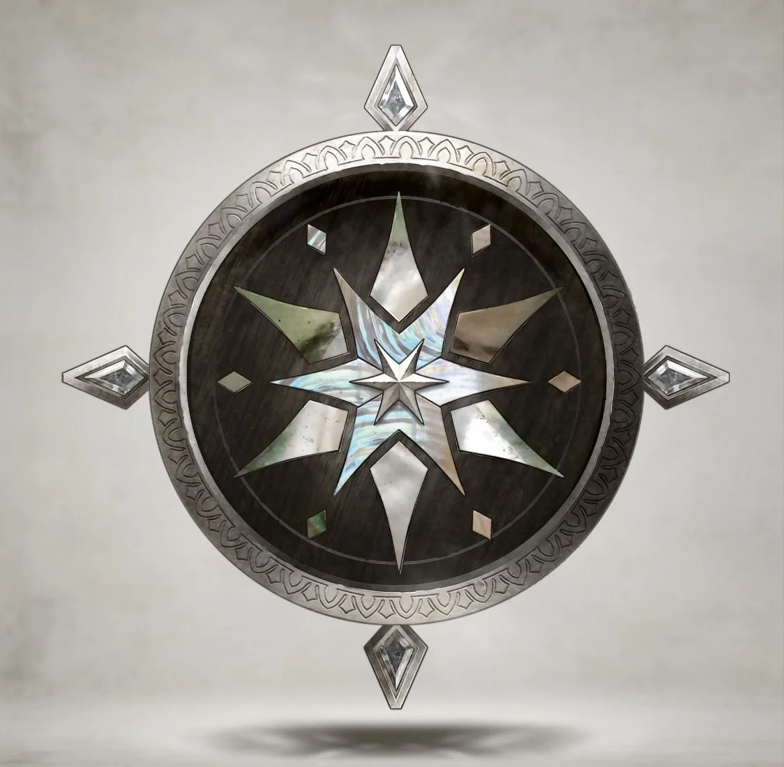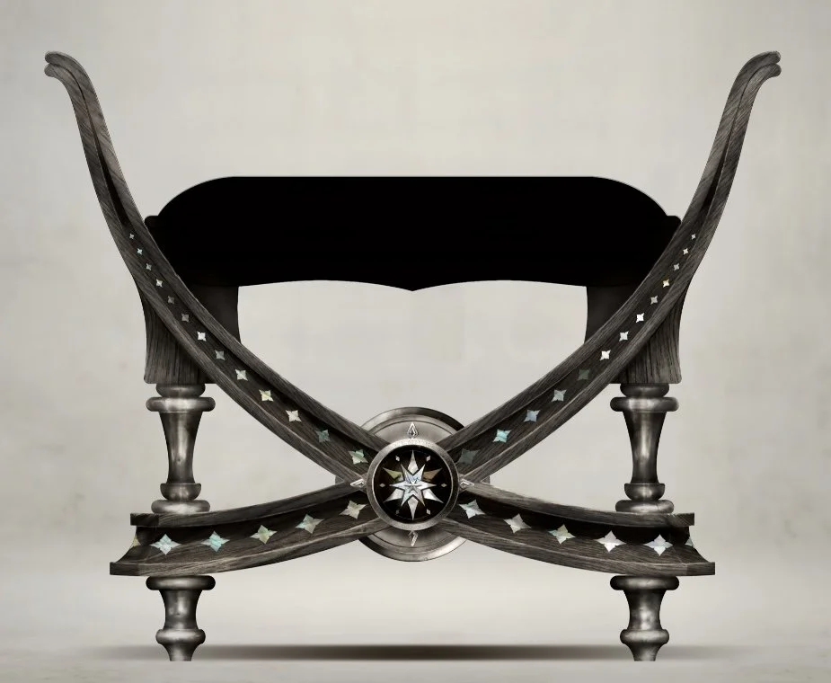 Decorative table with crossed wooden arms and star-shaped inlays, featuring a central compass motif, set against a plain background.