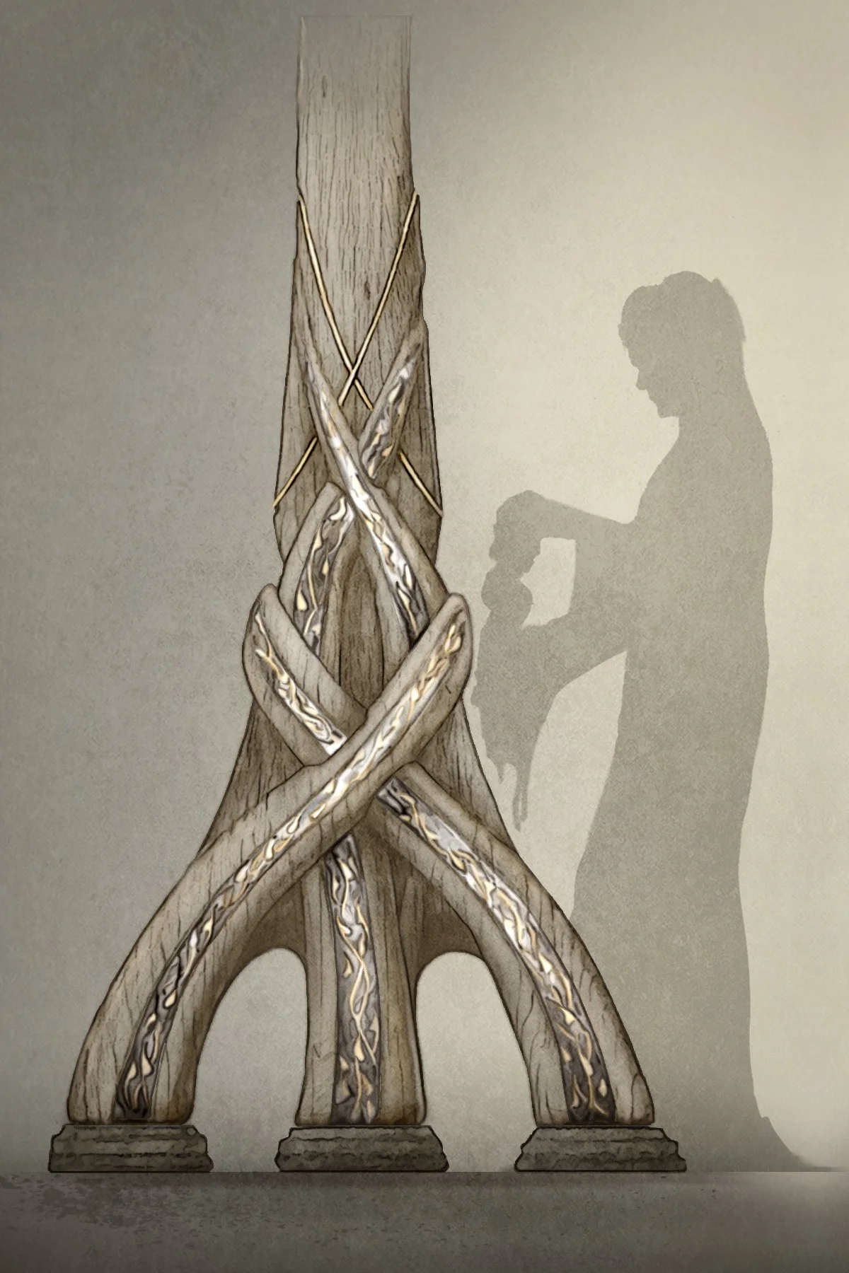 A wooden sculpture resembling a stylized tree with intertwined branches, illuminated to highlight the grain and design, casts a shadow of a person holding a camera on a light-colored wall.