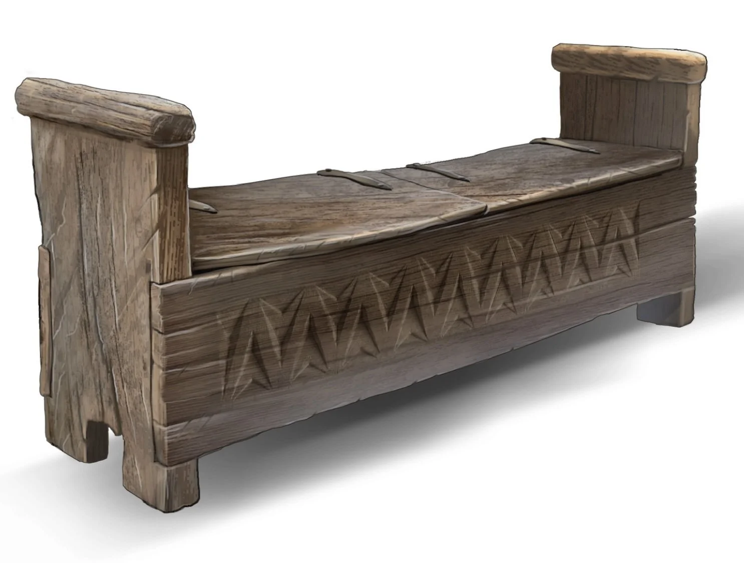A wooden bench with carved decorative pattern on the side and built-in armrests.