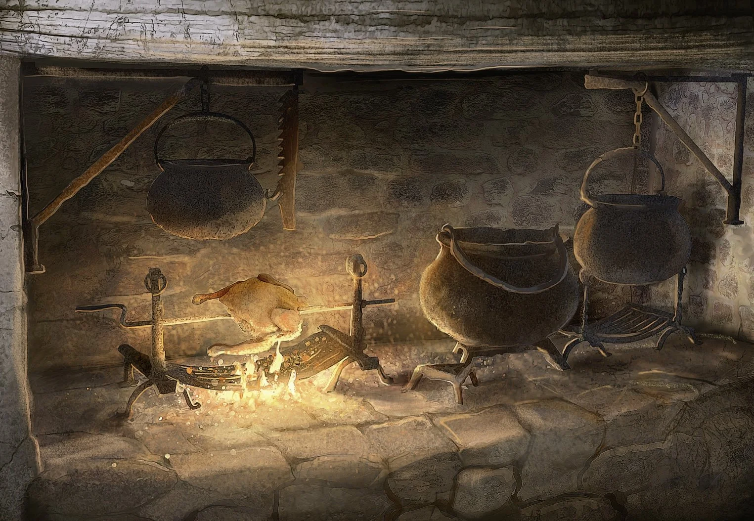 A traditional cast iron fireplace with a fire burning on the hearth, surrounded by three black cast iron kettles hanging from hooks, with a stone wall in the background.