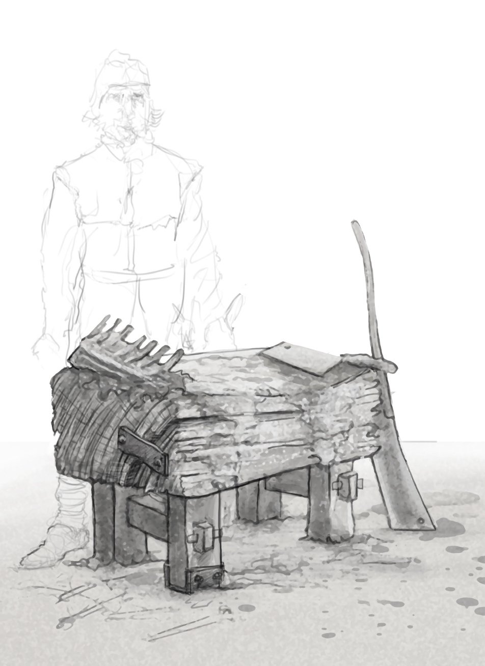 Sketch of a person in historical clothing standing behind a rustic wooden chopping block with a cleaver and a large rake or pitchfork resting on it.