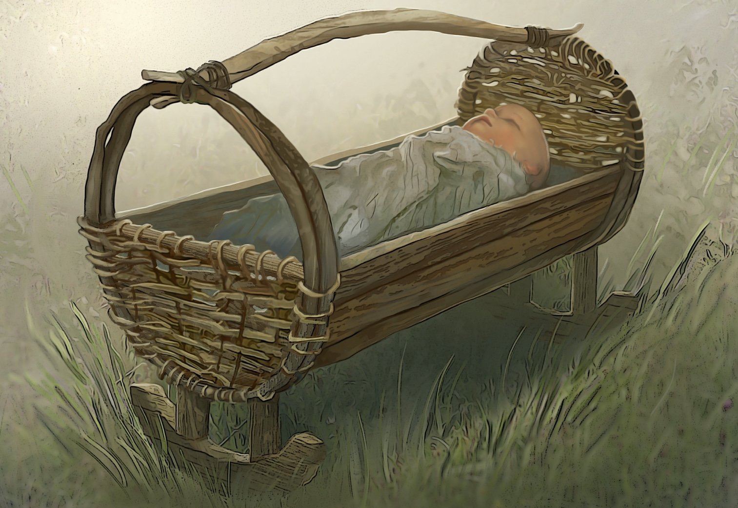 A baby sleeping in a wooden cradle outdoors, with grass surrounding it.