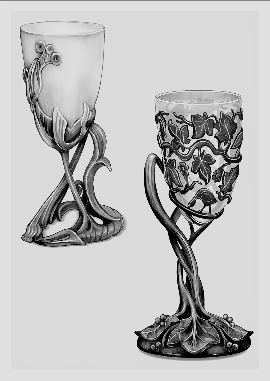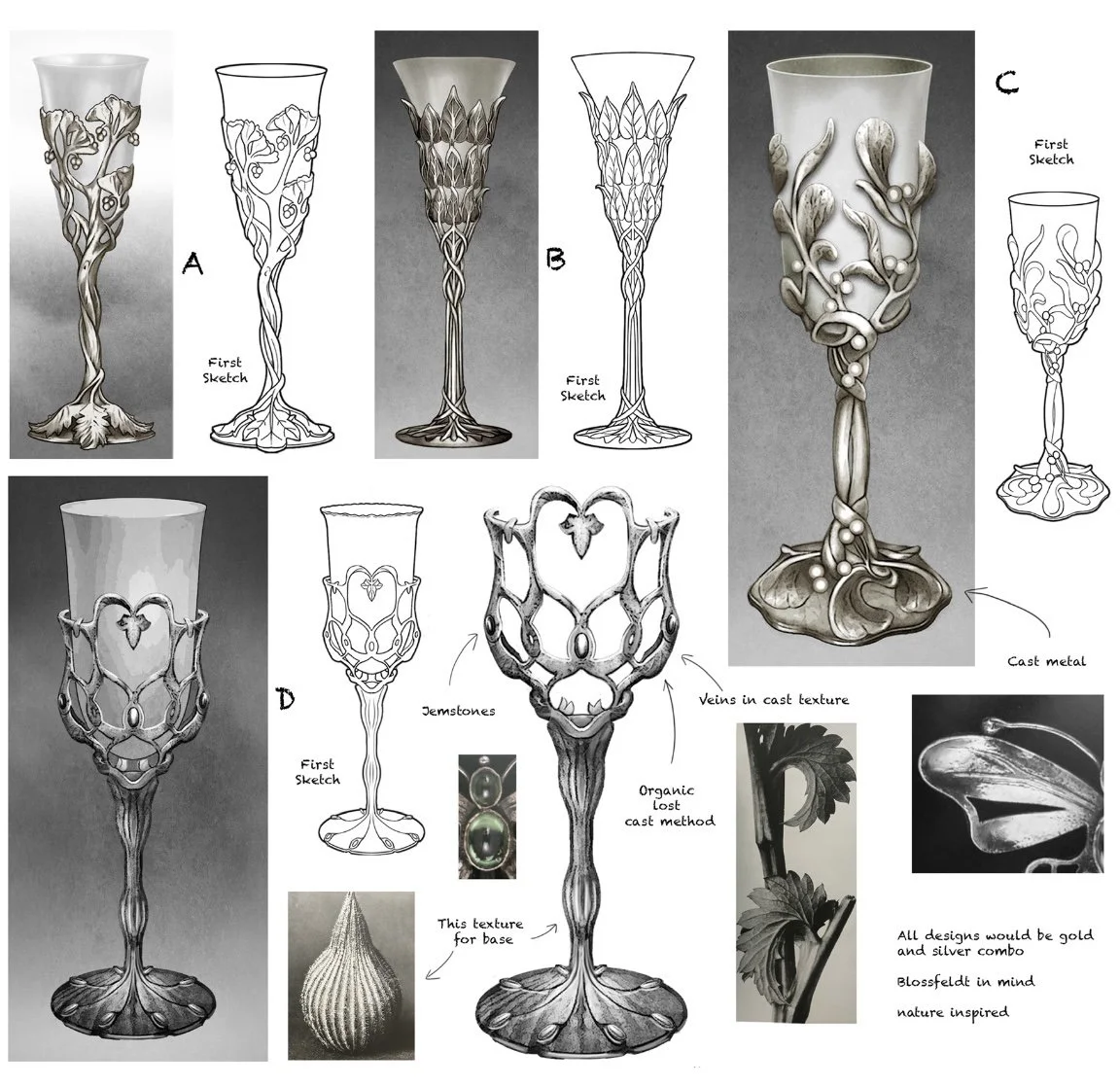 Design sketches and renderings of a decorative glass with a floral motif, showing different stages of design process including initial sketches, digital renderings, and close-up details of the raised petals and gemstones, inspired by nature and cast
