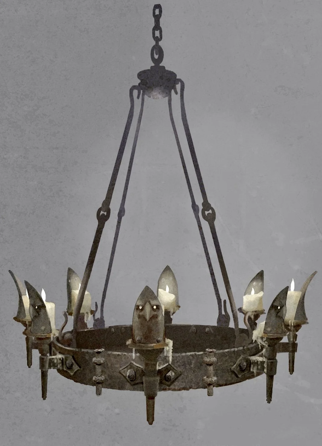 A rustic, old-fashioned chandelier with multiple candle-shaped lights, designed to resemble a medieval or gothic style, hanging from a chain against a plain background.